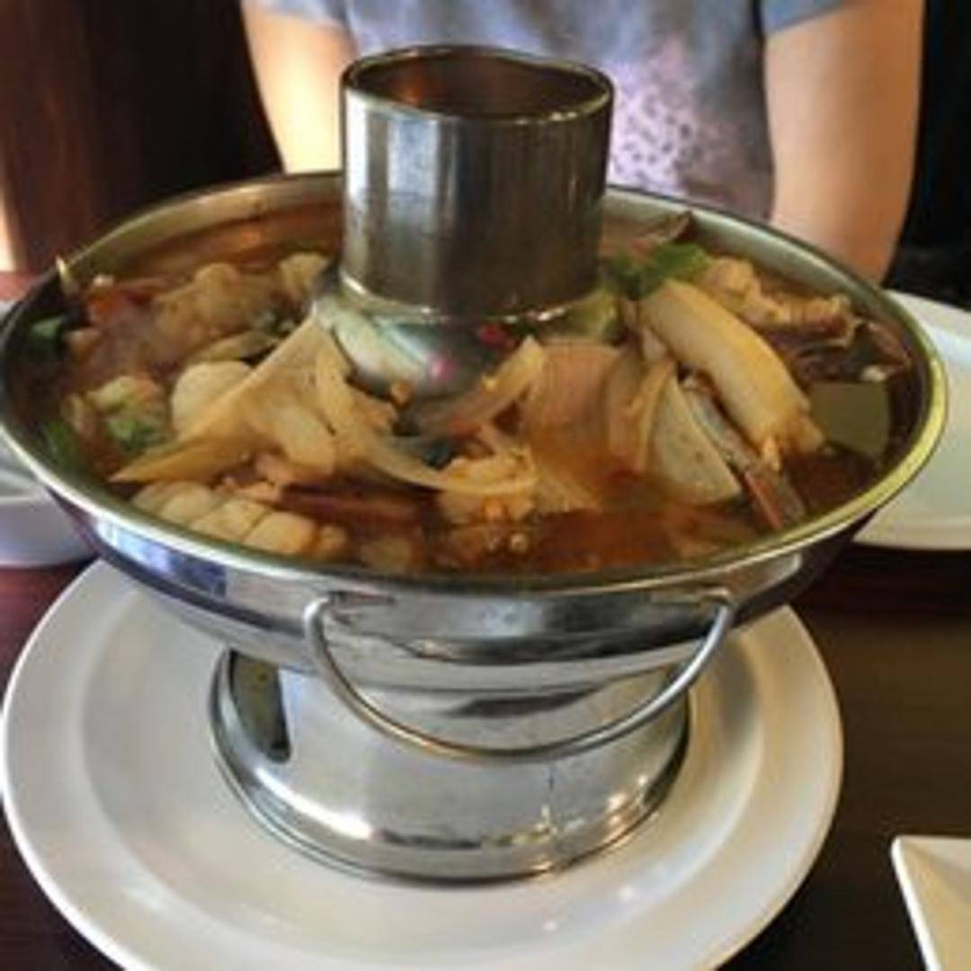 A flavorful and aromatic Thai soup featuring a medley of fresh seafood. This soup typically includes shrimp, squid, mussels, and fish simmered in a spicy and sour broth infused with lemongrass, galangal, kaffir lime leaves, and chili. Expect a vibrant blend of savory, spicy, and sour flavors with a hint of sweetness. Garnished with cilantro and Thai basil for added freshness.