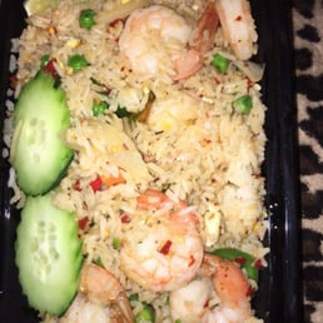 Classic Thai fried rice featuring succulent shrimp, fluffy rice, scrambled egg, onions, peas, carrots, and a blend of traditional Thai seasonings. Wok-fried to perfection for a savory and satisfying meal.