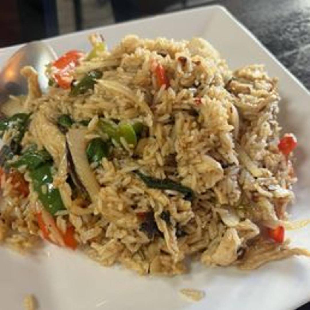 Thai-style fried rice stir-fried with eggs, onions, carrots, peas, and your choice of protein (chicken, beef, pork, tofu, or vegetables). Seasoned with chili paste and Thai spices for a flavorful and fiery kick.