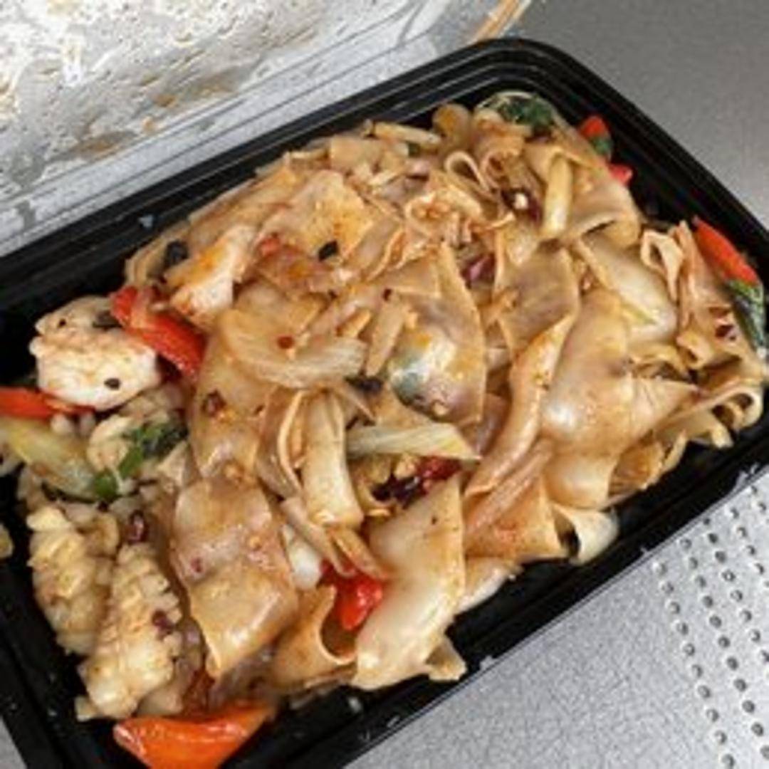 Wide rice noodles stir-fried with your choice of protein (chicken, pork, beef, tofu, or vegetables), chili, garlic, basil, onions, bell peppers, and tomatoes in a savory and slightly sweet sauce. A flavorful and spicy noodle dish with a satisfying chew.