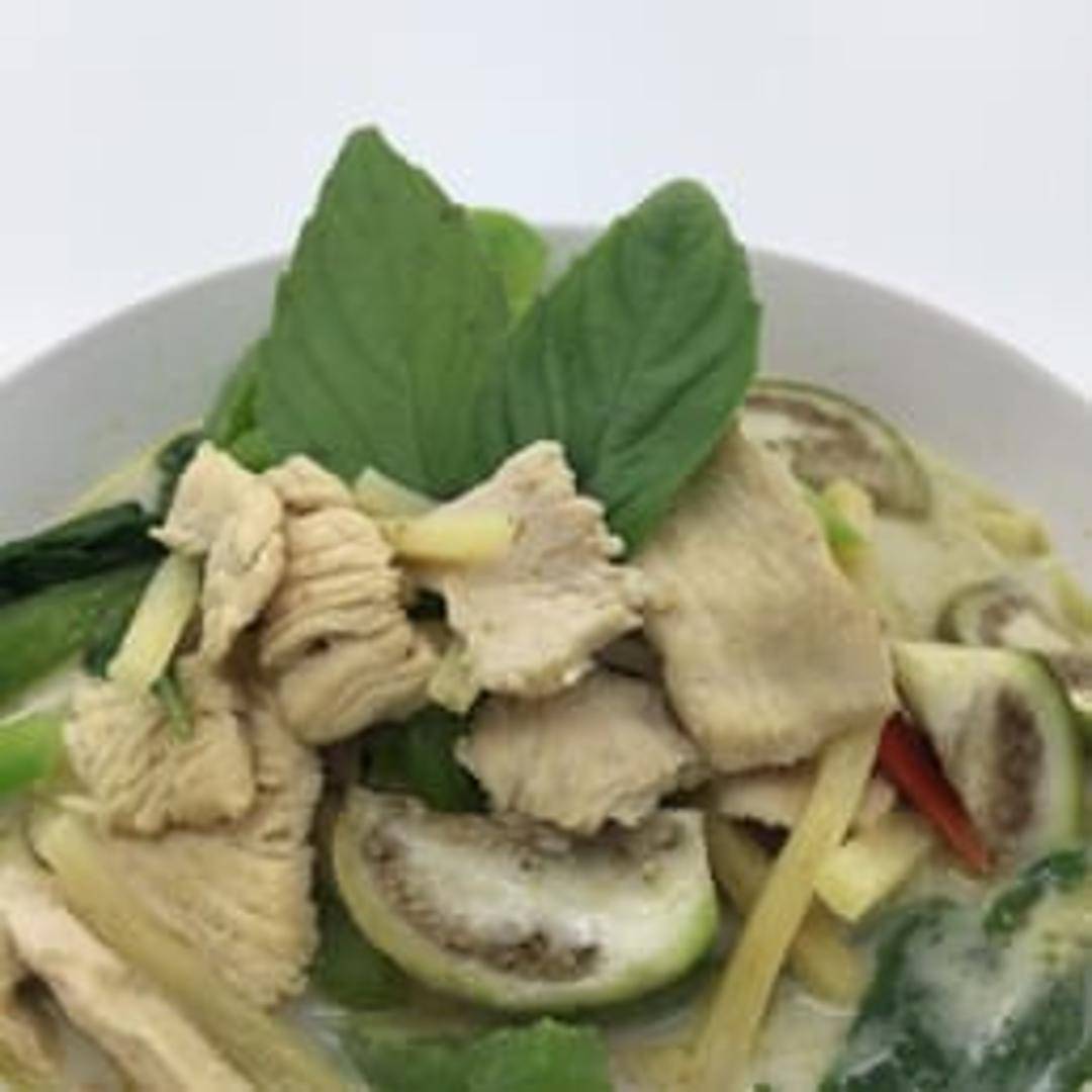 A vibrant and aromatic green curry made with coconut milk, bamboo shoots, bell peppers, eggplant, basil leaves, and your choice of protein. Served with steamed jasmine rice. Medium spiced with a rich and complex flavor profile.