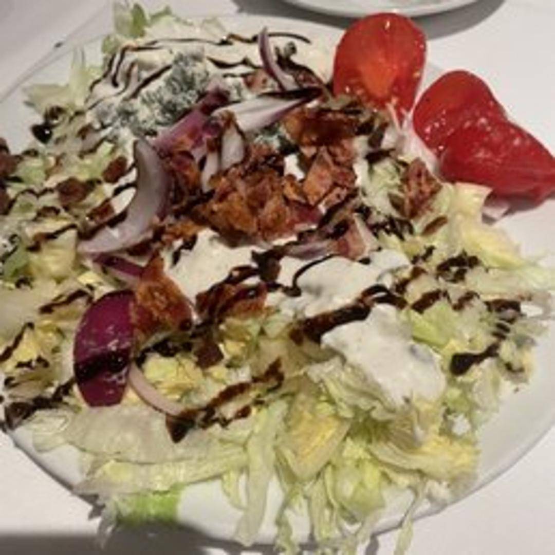 A crisp wedge of iceberg lettuce, topped with creamy bleu cheese dressing, crumbled bacon, chopped tomatoes, and red onions.