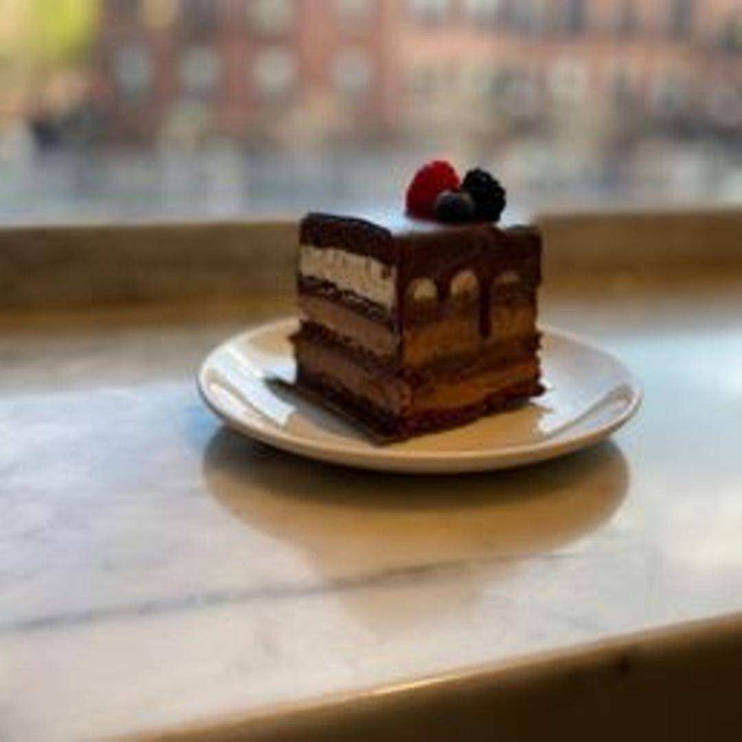 A decadent and rich chocolate mousse cake layered with chocolate cake and topped with a ganache.