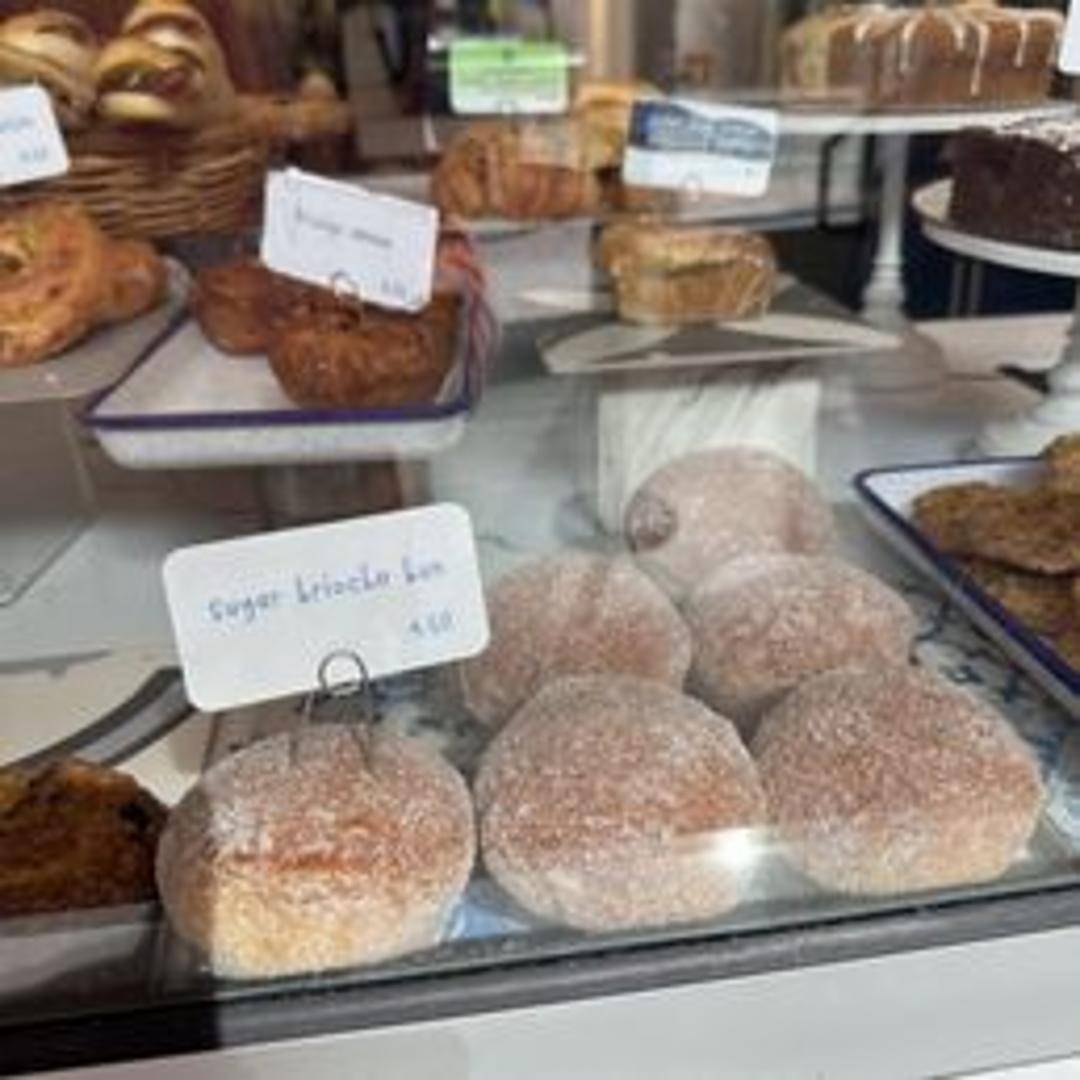 A soft and buttery brioche roll generously sprinkled with sugar, offering a sweet and satisfying treat.