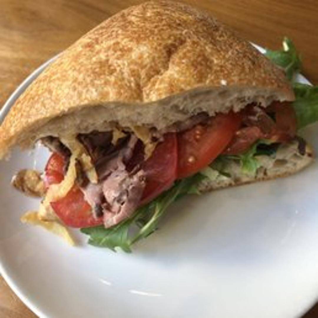 Slow-roasted roast beef piled high on Flour's homemade bread, topped with horseradish mayo, sharp cheddar cheese, pickled onions, and crisp lettuce.