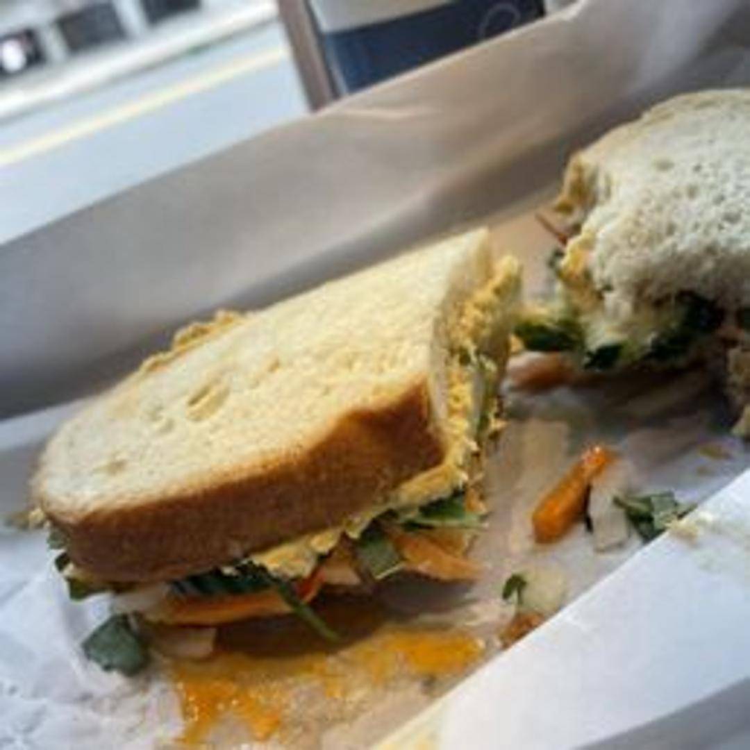 A hearty and healthy sandwich featuring creamy house-made hummus, fresh vegetables like cucumbers, sprouts, and tomatoes, and a drizzle of tahini sauce on your choice of bread. Vegan and full of flavor.