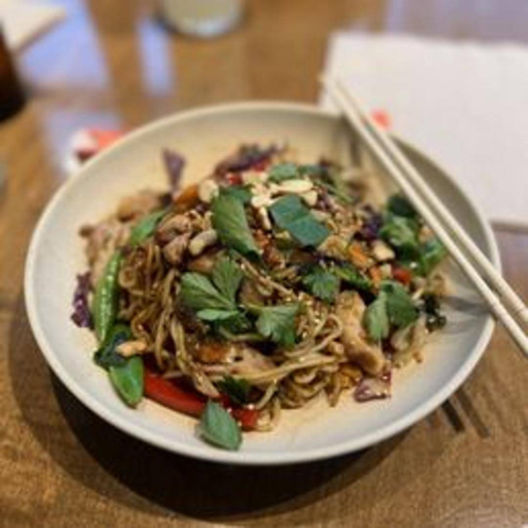 Stir-fried yakisoba noodles with grilled chicken, broccoli, carrots, sesame seeds, scallions and a sweet and savory yakisoba sauce.