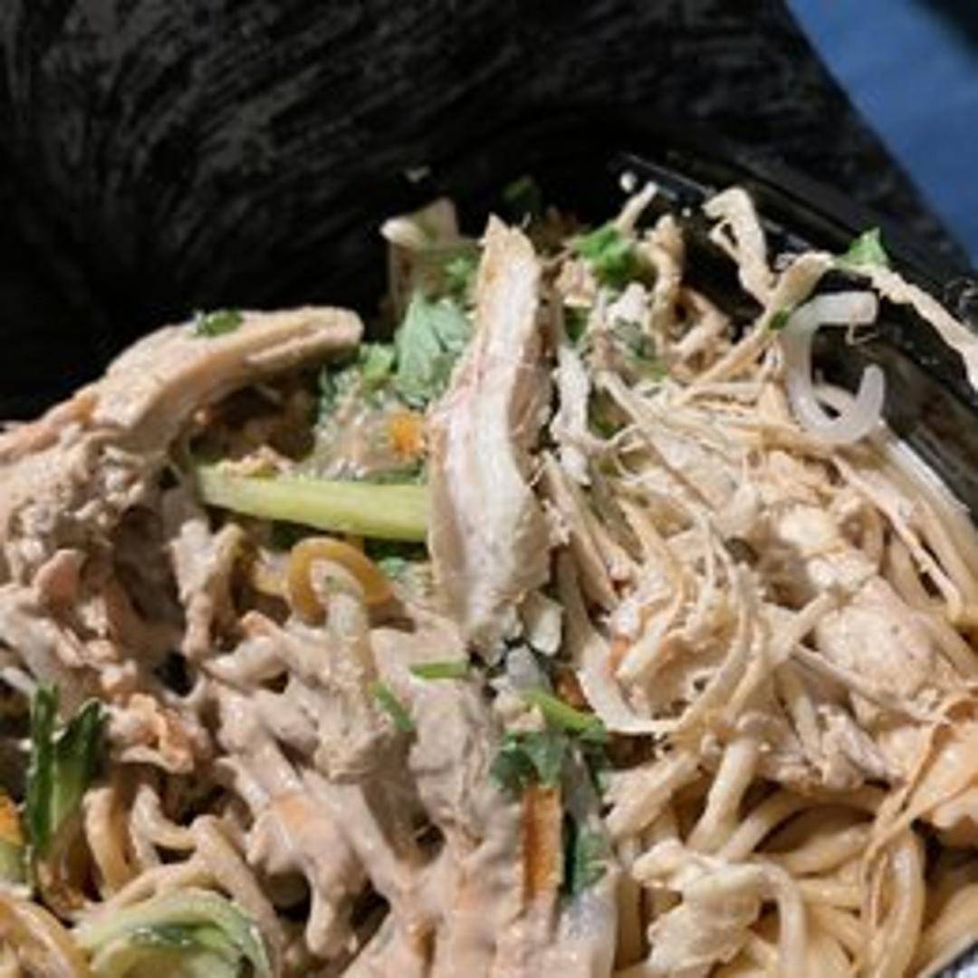 Chilled noodles tossed with shredded chicken and a creamy, nutty sesame sauce. Topped with sesame seeds.