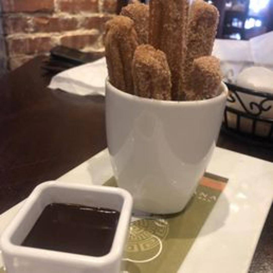 Warm, crispy churros filled with a sweet cream cheese filling. Dusted with cinnamon sugar and served with a side of chocolate sauce for dipping.