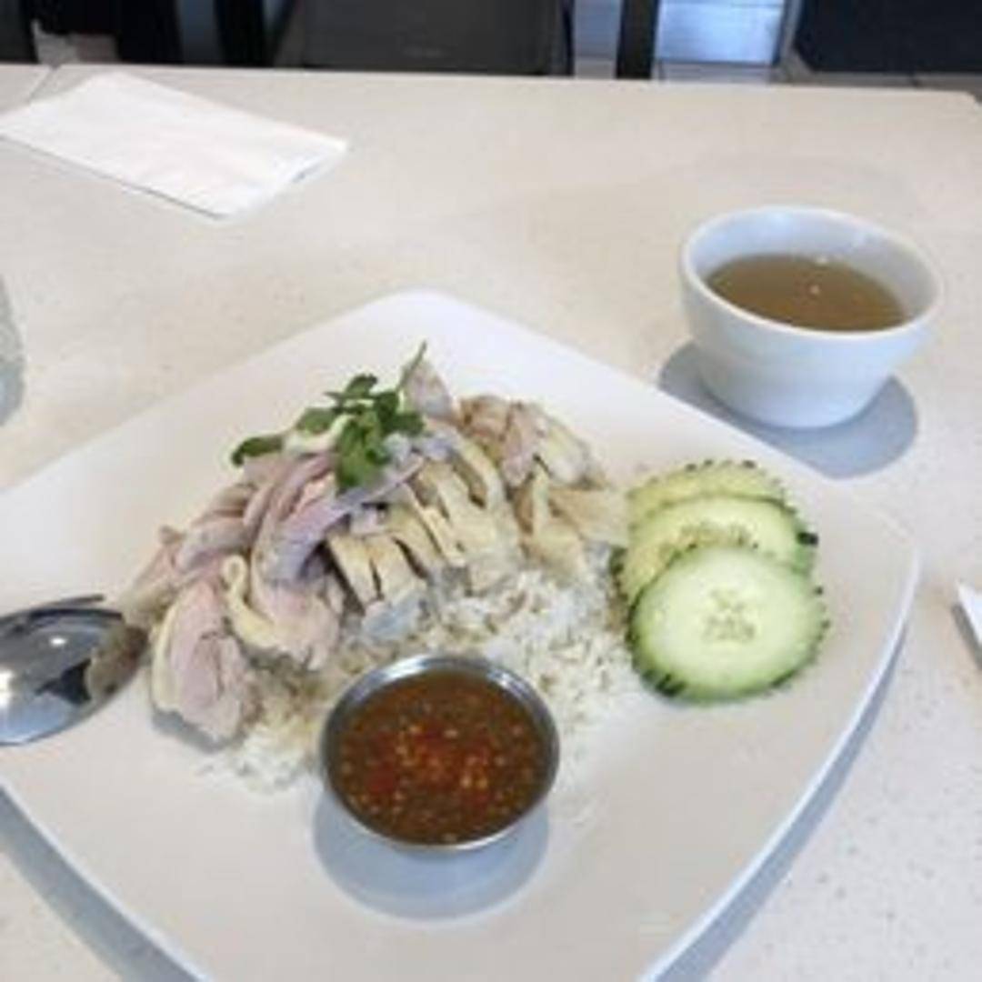 Poached chicken served with fragrant rice cooked in chicken broth, accompanied by ginger-scallion sauce and chili sauce.