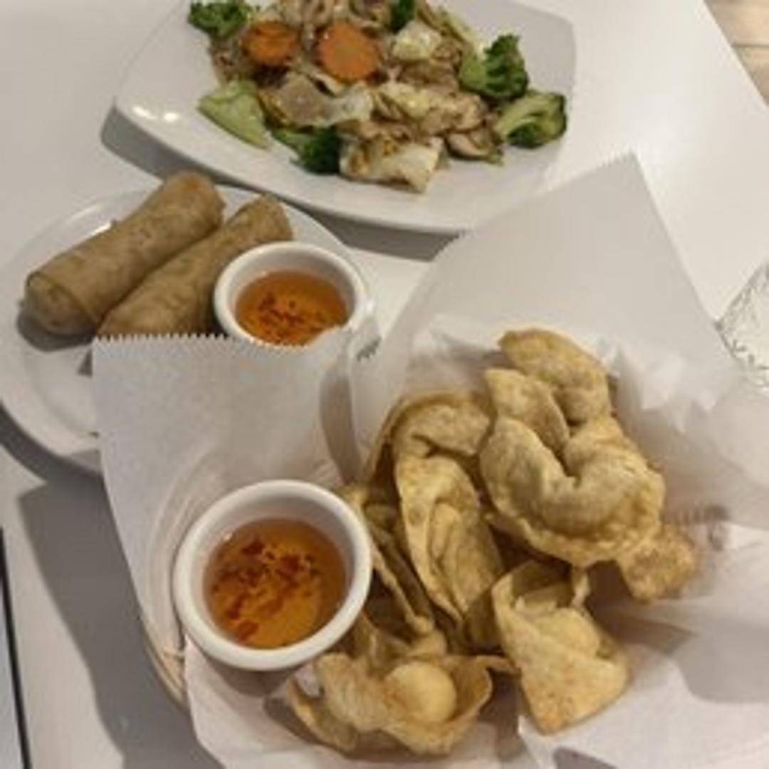Deep-fried vegetable spring rolls served with a sweet and sour dipping sauce.