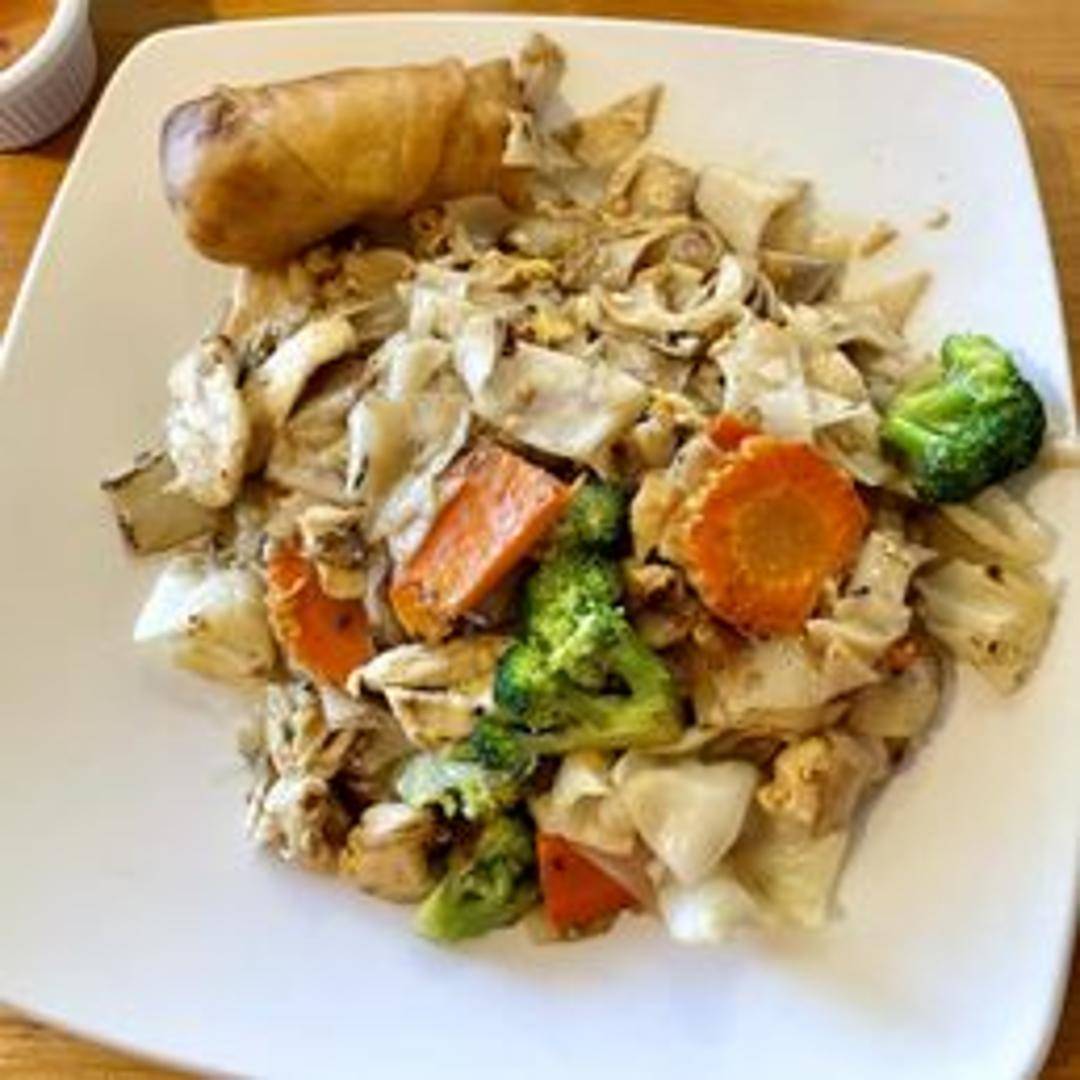 Wide rice noodles stir-fried with Chinese broccoli, egg, and a sweet soy sauce. May contain meat or tofu.