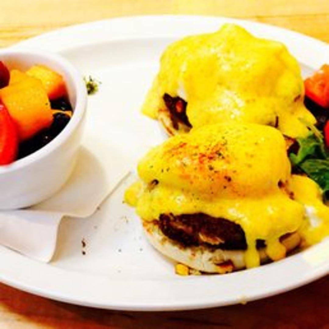 Classic Eggs Benedict variation featuring pan-seared crab cakes topped with poached eggs and hollandaise sauce, served on English muffins.