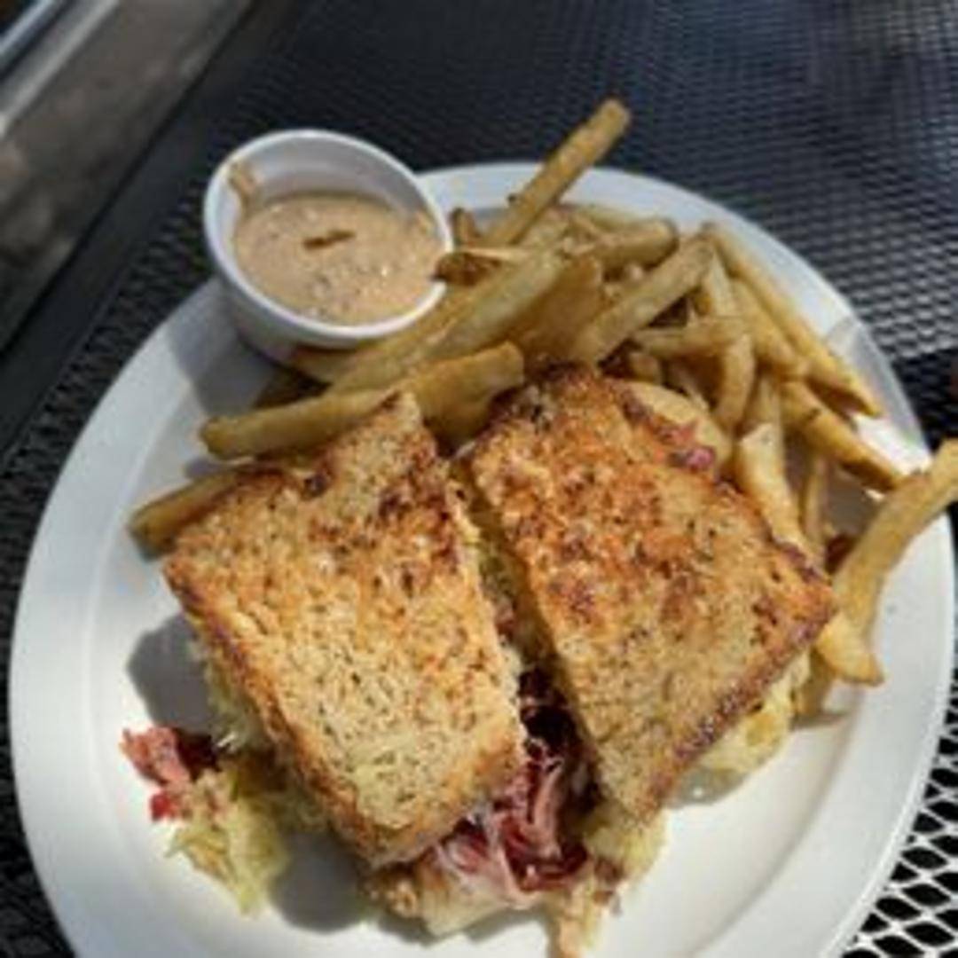 Grilled sandwich featuring corned beef, Swiss cheese, sauerkraut, and Russian dressing on rye bread.
