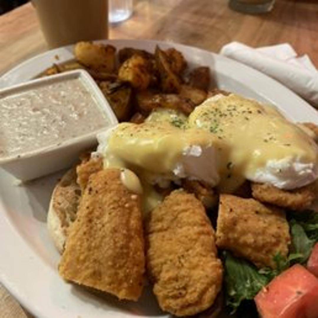 Eggs Benedict variation featuring fried chicken replacing the traditional Canadian bacon or ham, topped with poached eggs and hollandaise sauce, served on English muffins.