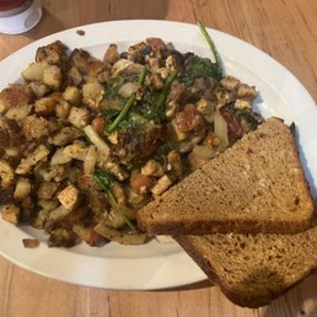 Crumbled tofu sautéed with vegetables, herbs, and spices, mimicking the texture and flavor of scrambled eggs, often served with toast or sides.