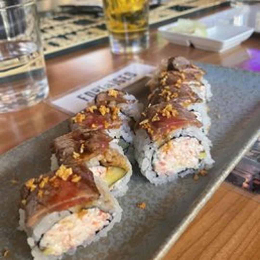 A combination of seafood and meat in one roll. Usually including shrimp tempura or lobster with steak, avocado, cucumber and special sauce.