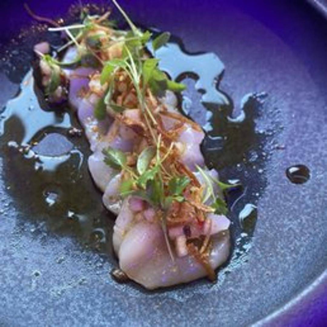 Pan-seared or grilled scallops served with seasonal accompaniments.