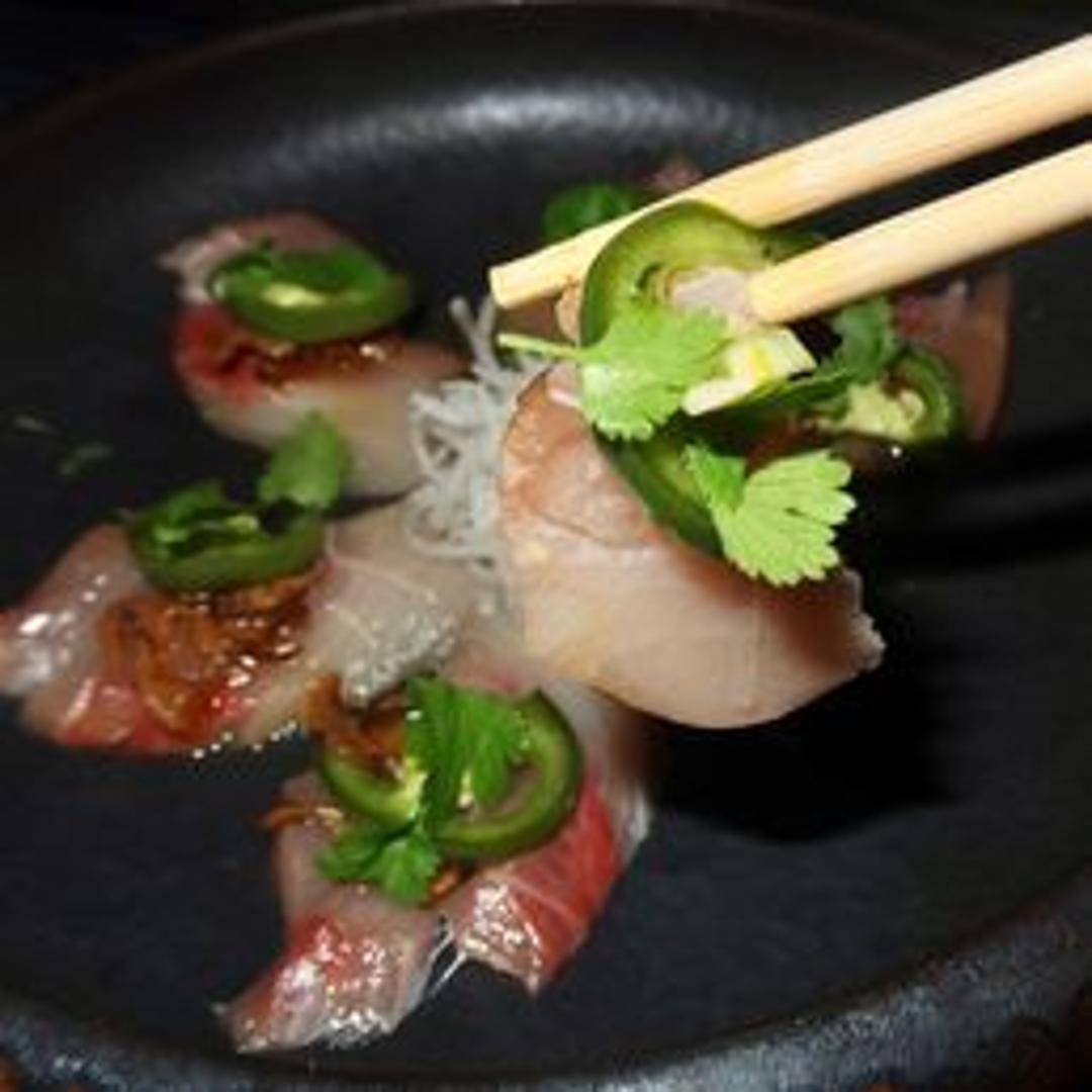 Thinly sliced, fresh Yellowtail (Hamachi) sashimi served with ponzu sauce and fresh garnishes.