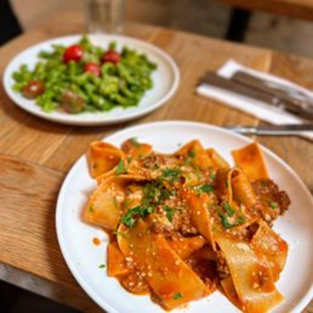 Wide, flat noodles coated in a rich and hearty meat sauce. This features slow-cooked beef and pork ragu with tomatoes, onions, carrots, celery, and a hint of red wine, blanketing the pappardelle pasta. A satisfying and comforting Italian classic.