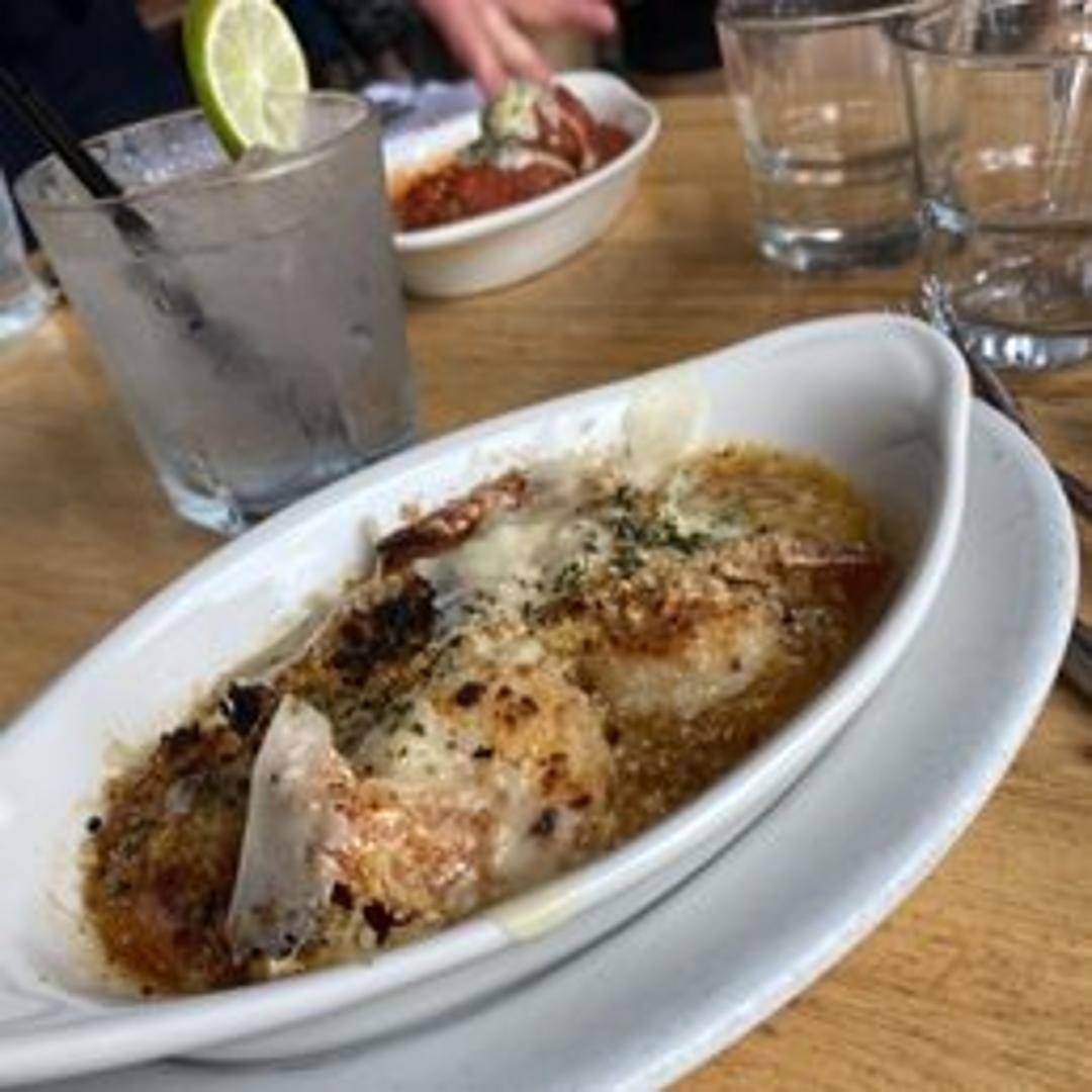 Succulent, plump shrimp perfectly roasted until tender, infused with the mellow, aromatic essence of sweet roasted garlic cloves. This flavorful dish highlights the natural sweetness of the shrimp, complemented by the rich, savory notes of the garlic, often served with a light sauce or crusty bread for dipping.