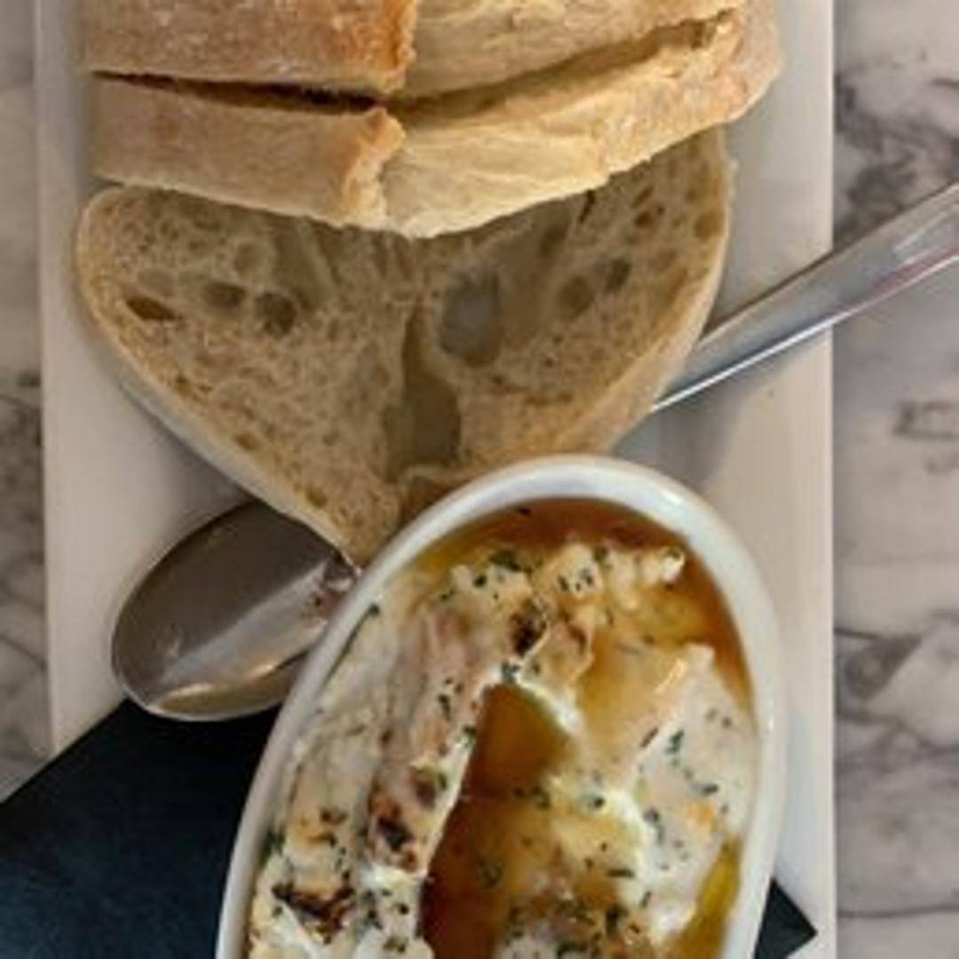 A delicate and creamy ricotta cheese, served warm to enhance its subtle, milky flavors. This comforting appetizer is often presented with a drizzle of fine olive oil, a sprinkle of fresh herbs, and crusty bread or crostini, perfect for spreading.