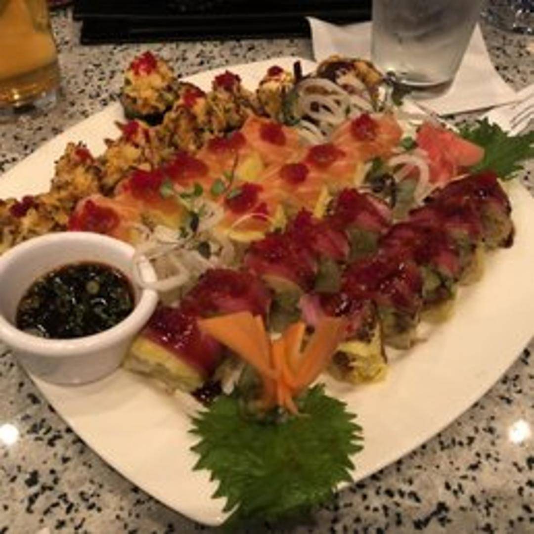 A delectable sushi roll featuring tempura shrimp, avocado, and cream cheese, topped with black tobiko and a sweet eel sauce.