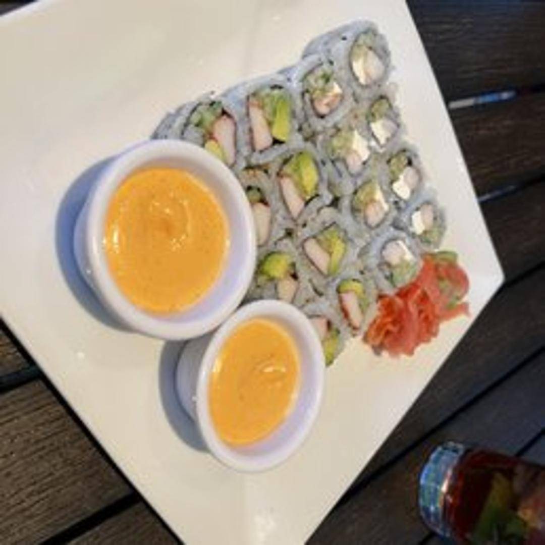 A classic sushi roll featuring imitation crab meat, avocado, and cucumber, rolled in seasoned sushi rice and nori seaweed, then coated with toasted sesame seeds.