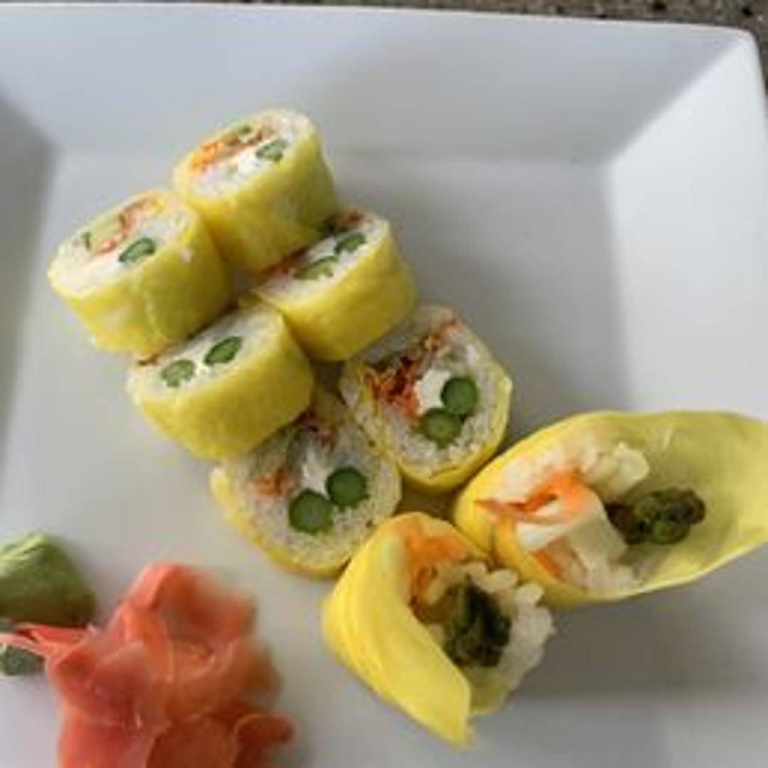 A refreshing vegetarian sushi roll featuring crisp cucumber, creamy avocado, fresh carrots, and vibrant spring mix, all expertly rolled in seasoned sushi rice and nori seaweed. Served with a side of ginger and wasabi.