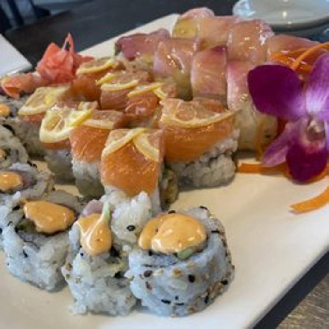 A vibrant sushi roll featuring a combination of fresh seafood and colorful toppings. Commonly includes tuna, avocado, cucumber and a special sauce.