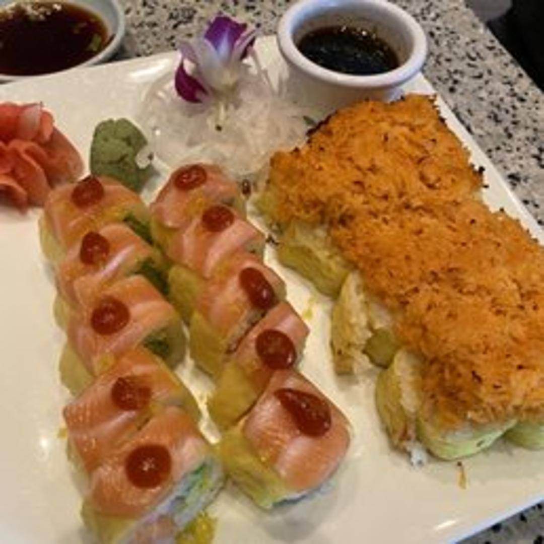 A towering and flavorful sushi roll. Tempura shrimp and cream cheese are rolled with sushi rice and nori seaweed, then topped with crab salad, spicy mayo, and eel sauce. A truly monstrously delicious experience, served with a side of ginger and wasabi.
