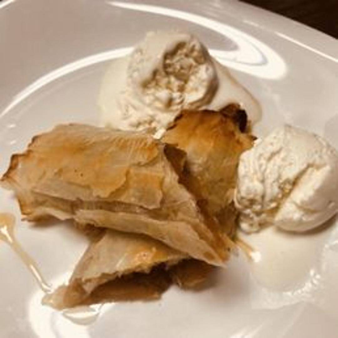 A classic apple pie with a flaky, buttery crust and a sweet and tart apple filling spiced with cinnamon and other warm spices. Served warm, often with a scoop of vanilla ice cream.