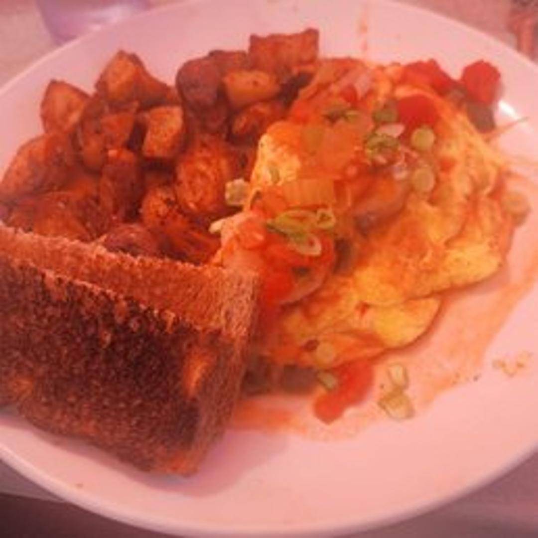 A fluffy omelette filled with Creole-spiced shrimp, onions, peppers, and cheese. Served with your choice of side.