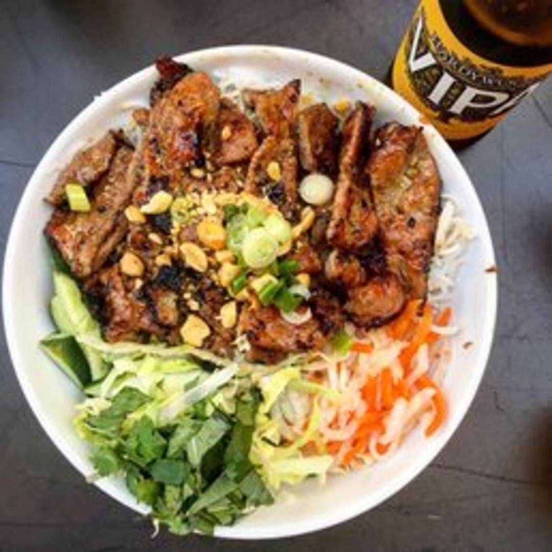 A classic Vietnamese 'Bún' dish, featuring a generous portion of chilled vermicelli noodles topped with your choice of savory grilled meats, crispy egg rolls, or fresh tofu. Accompanied by a medley of crisp lettuce, fresh herbs, pickled carrots and daikon, and crushed peanuts, all drizzled with our signature house nuoc cham dressing.