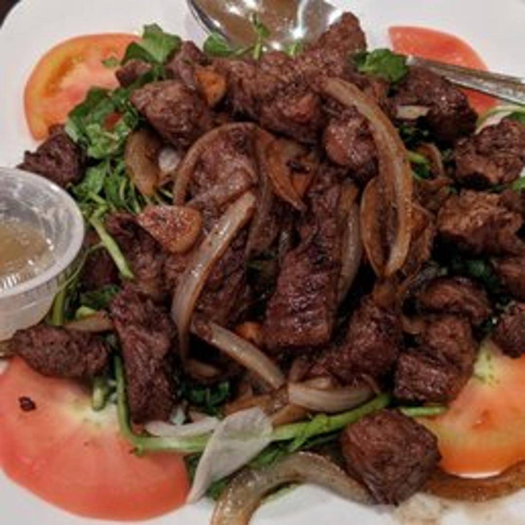 Cubes of premium beef, expertly marinated and wok-seared at high heat to achieve a tender interior and a slightly caramelized exterior. This flavorful dish is typically served over a bed of fresh lettuce and tomatoes, with a zesty lime-pepper dipping sauce.