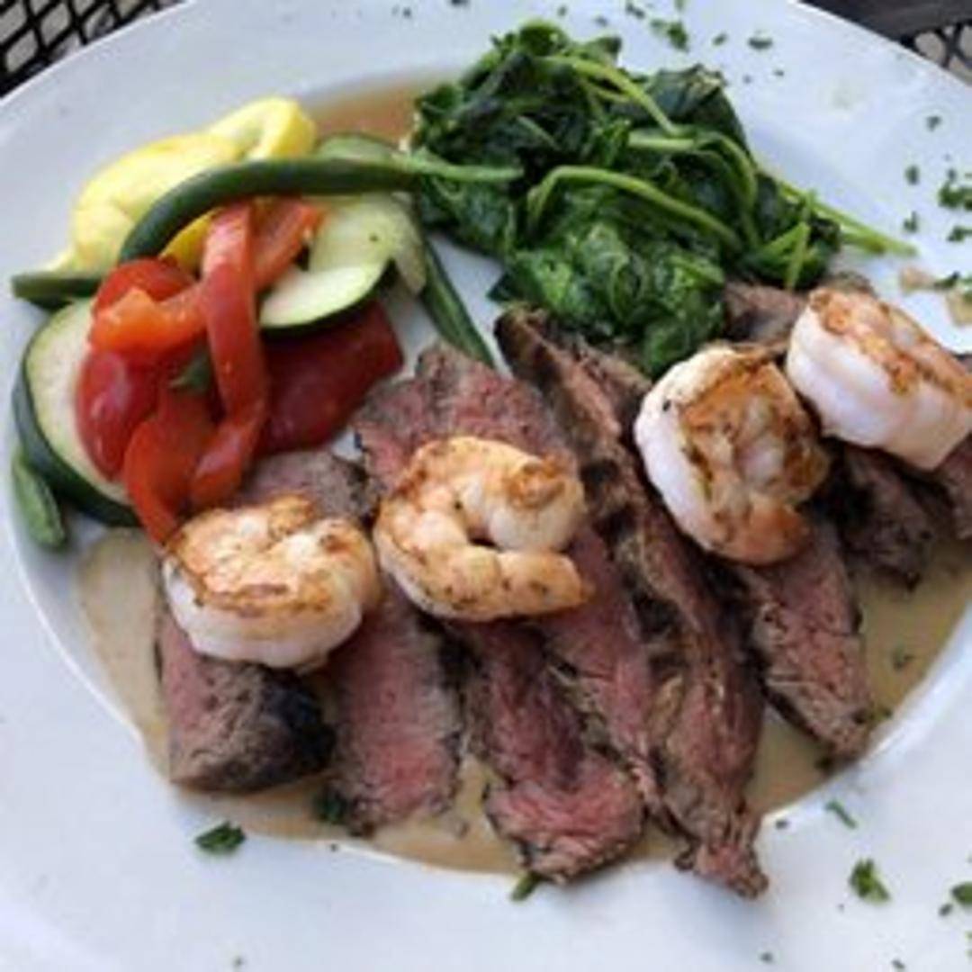 Grilled flank steak marinated in a blend of Southwestern spices. Served with a black bean and corn salsa, cilantro-lime rice, and a side of chipotle cream sauce. Garnished with fresh cilantro.
