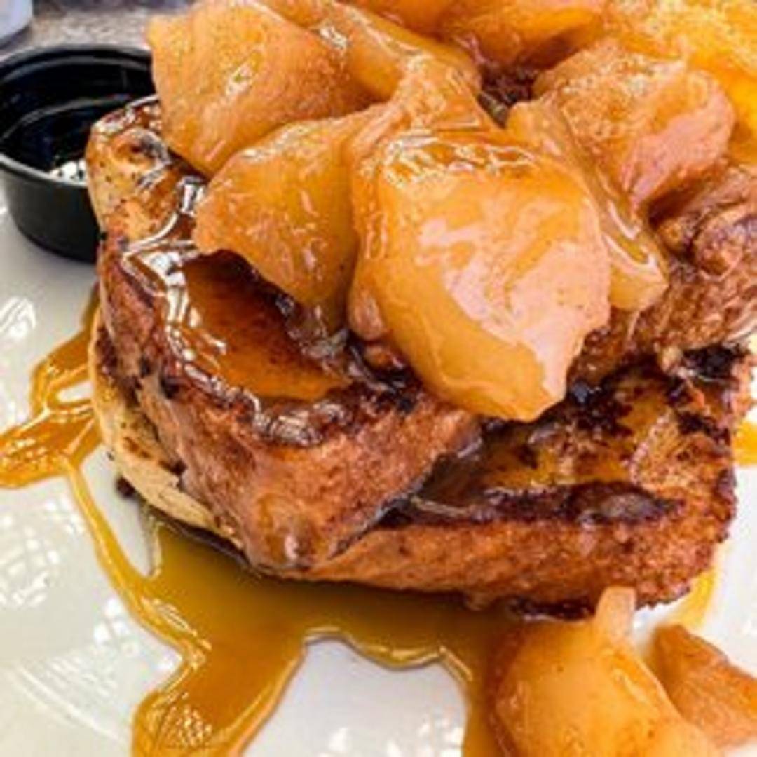 Thick-cut slices of brioche bread soaked in a rich custard batter, griddled to a golden brown, and dusted with powdered sugar. Served with a side of warm maple syrup and your choice of breakfast meat (bacon, sausage, or ham).