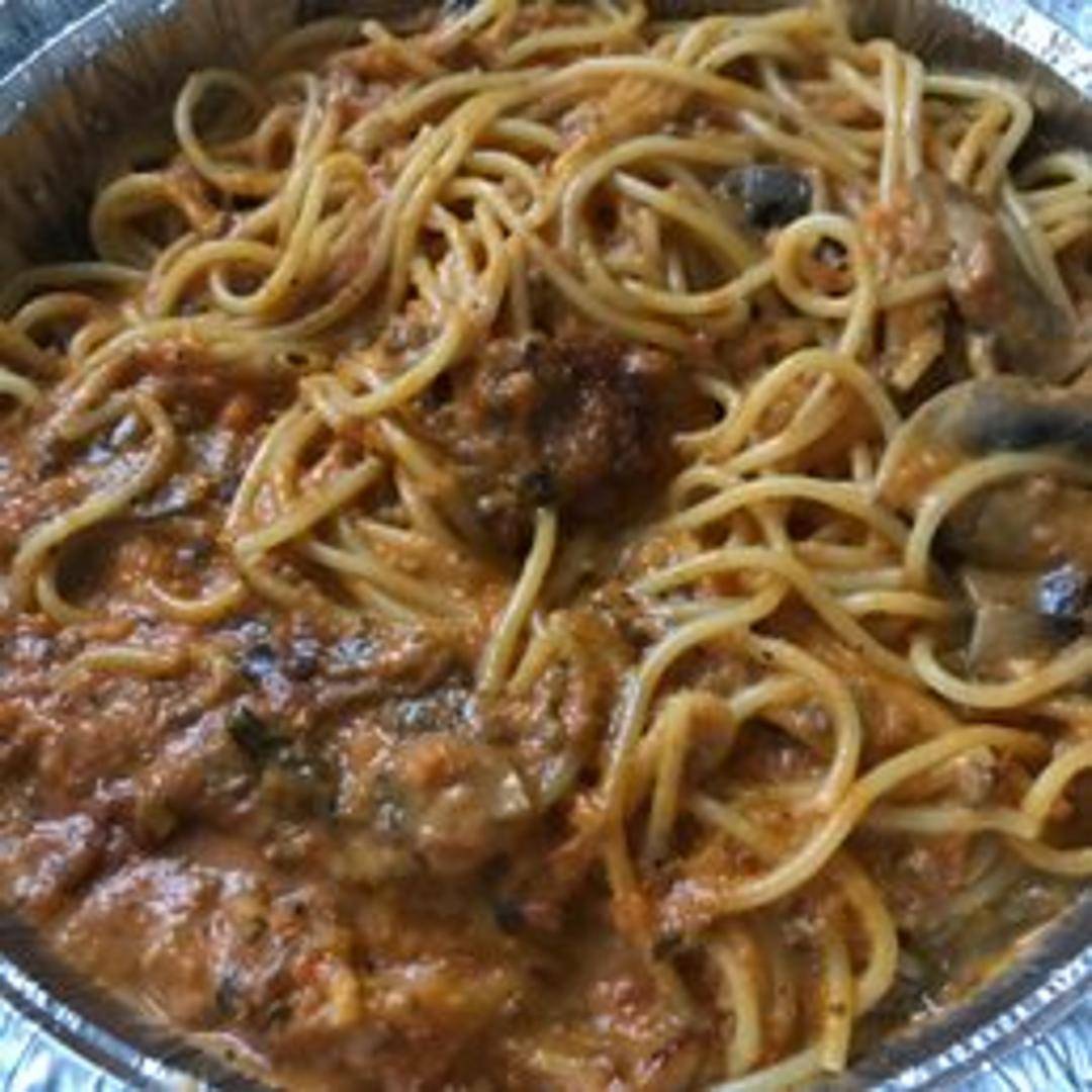 Classic Italian pasta dish featuring spaghetti tossed in a slow-cooked, rich meat sauce made with ground beef, vegetables, and herbs.