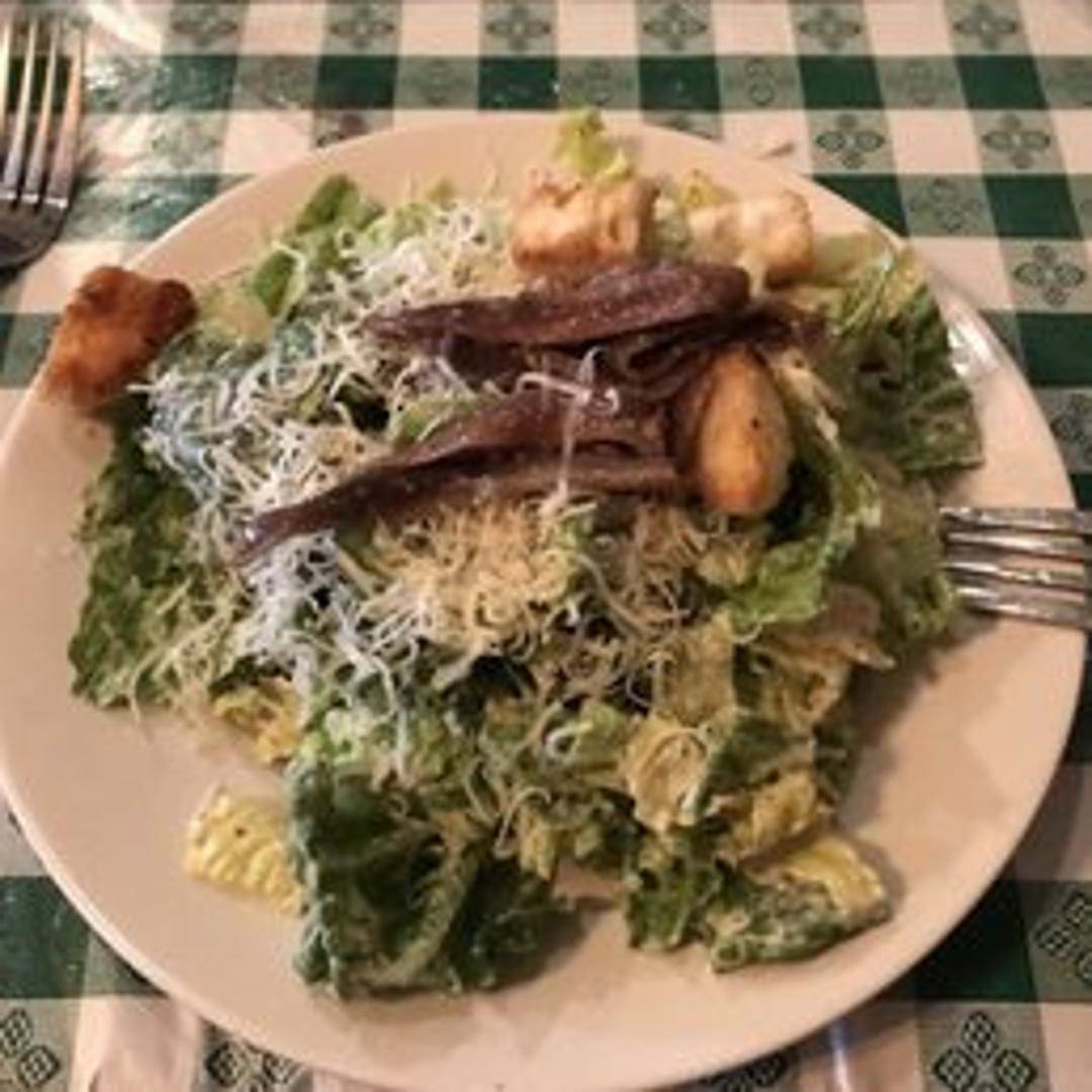 Romaine lettuce tossed with Caesar dressing, croutons, and Parmesan cheese. Often served with anchovies.