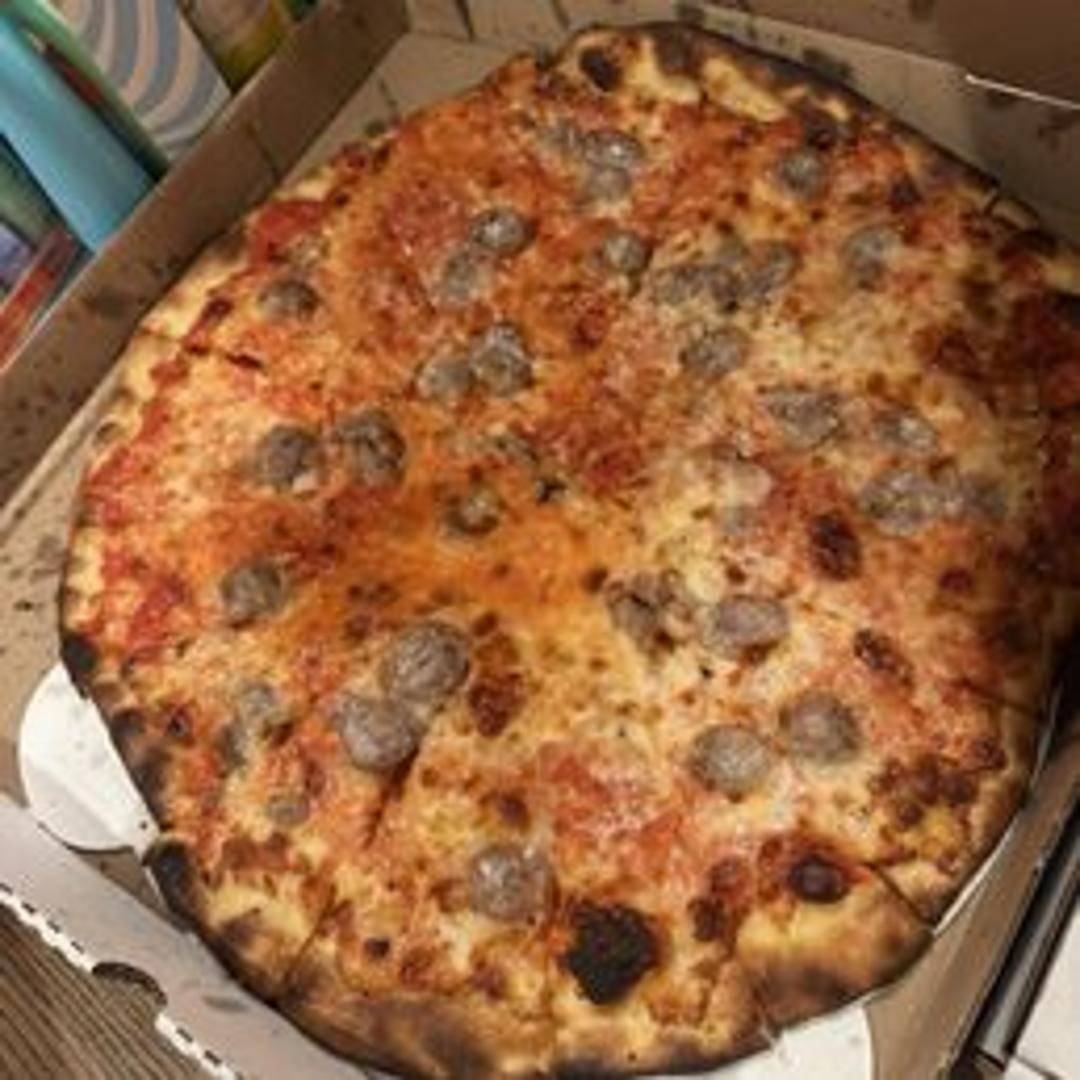 A white pie featuring crispy bacon and savory crumbled Italian sausage, topped with mozzarella cheese and a sprinkle of grated Romano cheese. Baked in a coal-fired oven for a slightly charred, smoky flavor.