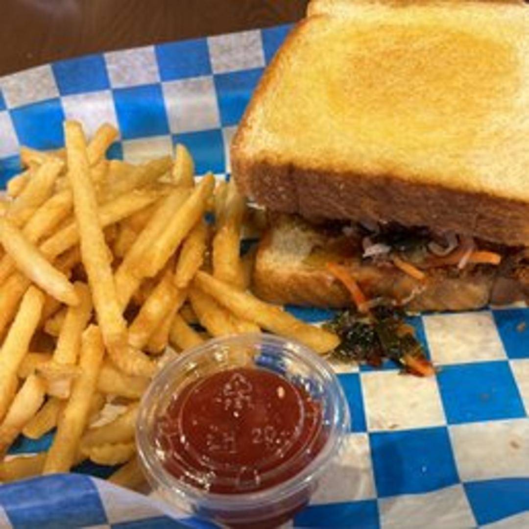 Crispy, spice-infused fried chicken breast slathered in Nashville hot sauce, topped with cool pickles and creamy coleslaw, all served on a toasted bun. A fiery and flavorful sandwich.