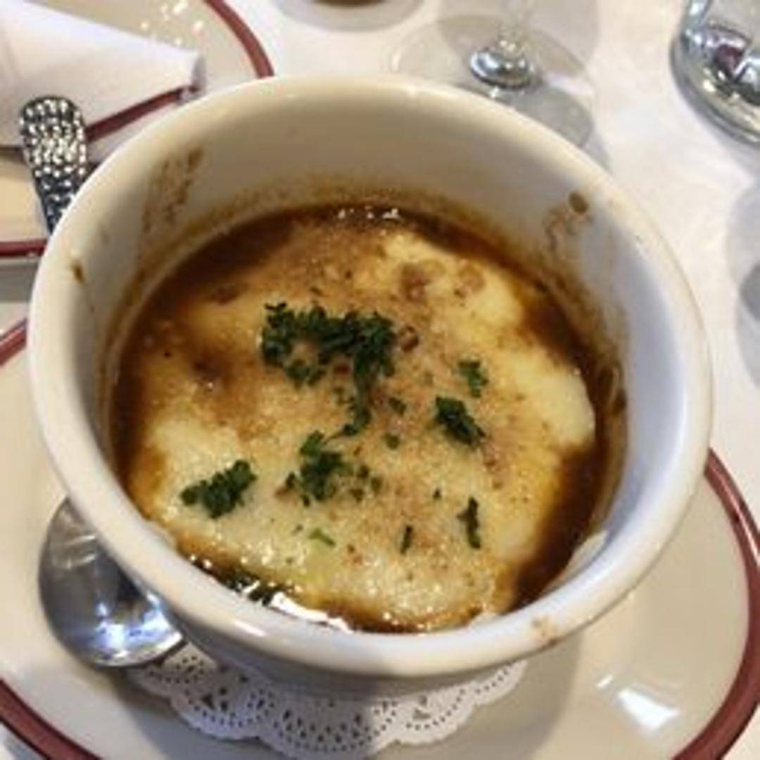 A classic and comforting French Onion Soup, slow-cooked with deeply caramelized sweet onions in a rich, savory beef broth, generously topped with a toasted baguette crouton and a bubbling, golden layer of melted Gruyère cheese.