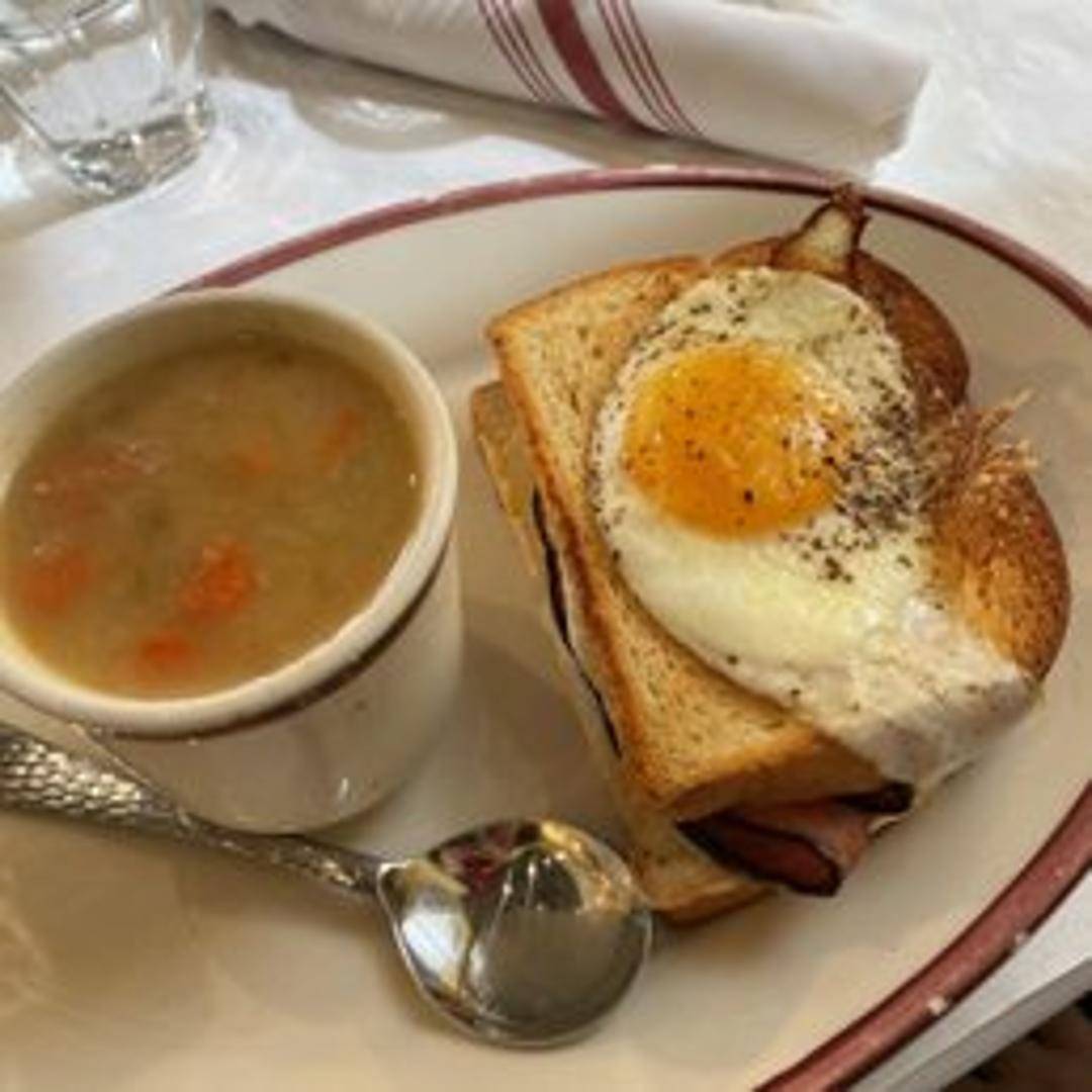 The quintessential French grilled sandwich, composed of savory slices of ham and rich Gruyère cheese nestled between two pieces of golden-toasted bread, generously coated with a creamy béchamel sauce and baked until perfectly melted and golden brown.