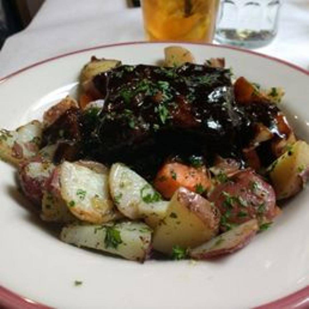 A substantial and flavorful cut of premium beef short rib, expertly prepared to achieve a melt-in-your-mouth tenderness. This rich dish highlights the inherent robustness of the beef, often served with a complementary, savory sauce to enhance its deep flavors.