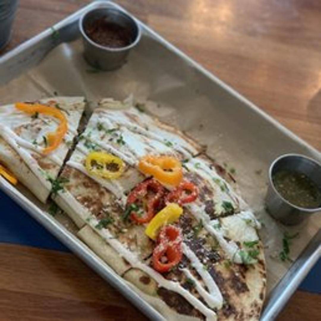 A golden-brown flour tortilla generously filled with savory shredded chicken and a melted blend of Monterey Jack and cheddar cheeses, with a hint of fresh pico de gallo. Grilled until crispy and served with sides of cool sour cream and vibrant salsa.
