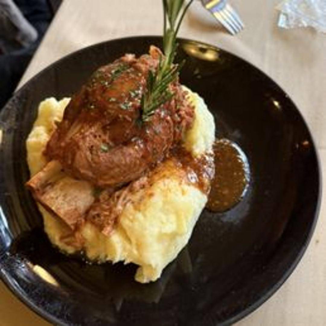 Slow-braised pork shanks in a rich vegetable and wine sauce.