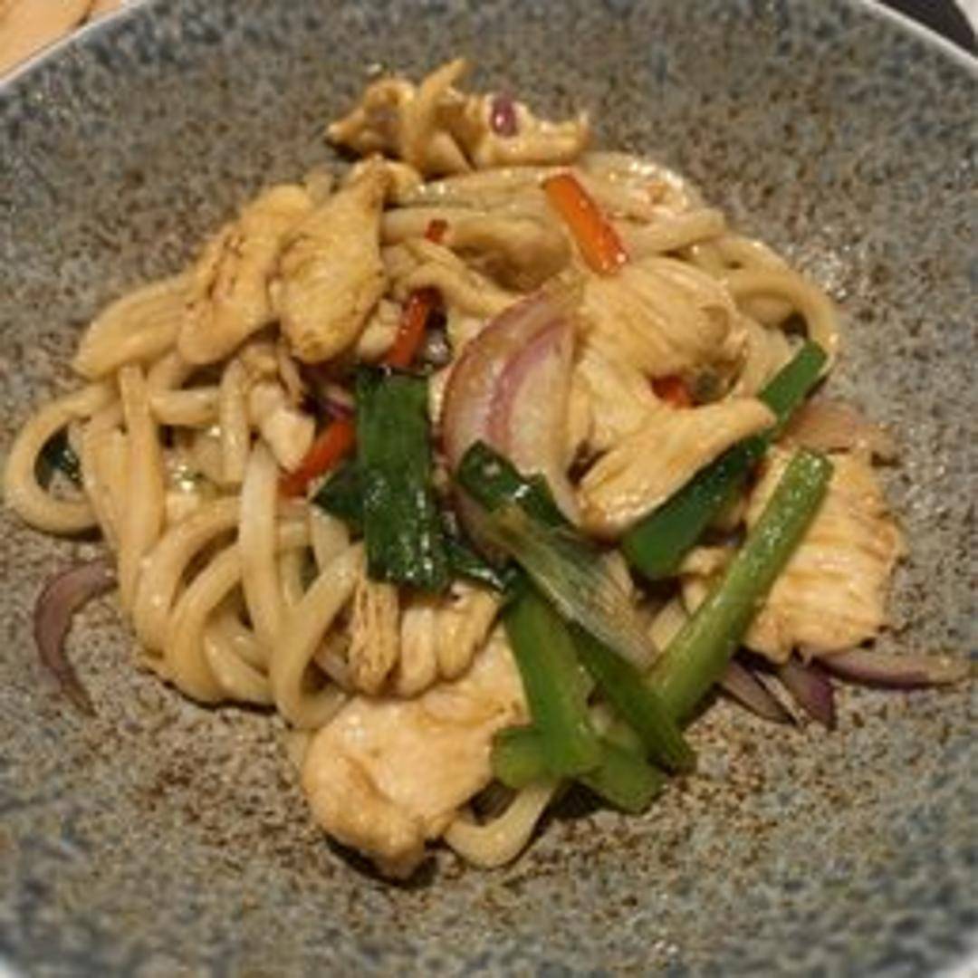 Thick, chewy udon noodles stir-fried with tender chicken and a flavorful sauce, featuring a medley of Asian vegetables.