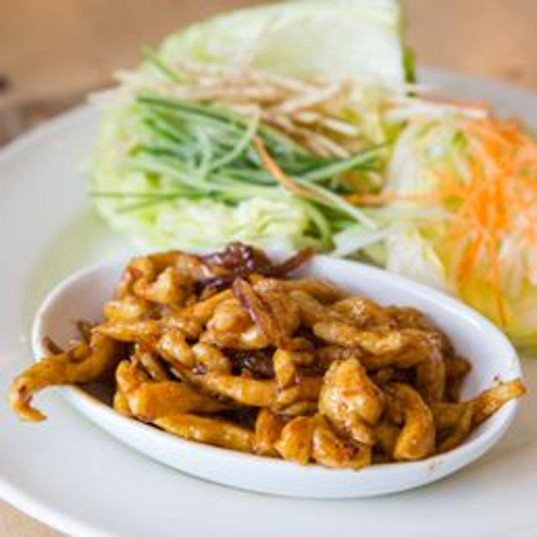 Fresh, grilled salmon served with crisp lettuce cups and an assortment of toppings and sauces for a light and flavorful customizable bite.