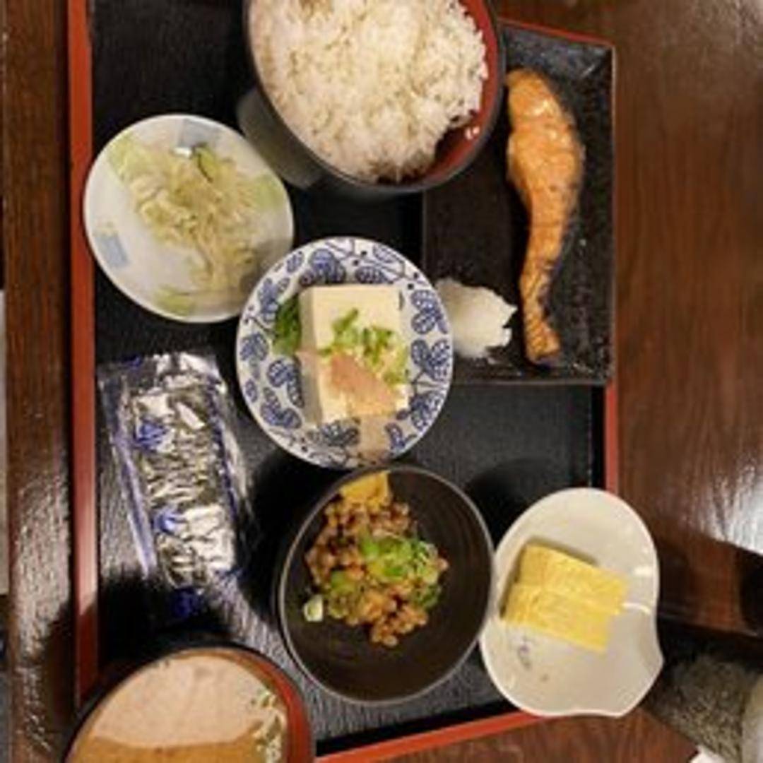 A variety of breakfast combinations featuring Japanese-inspired dishes. Includes items such as grilled fish, rice, miso soup, and Japanese pickles.