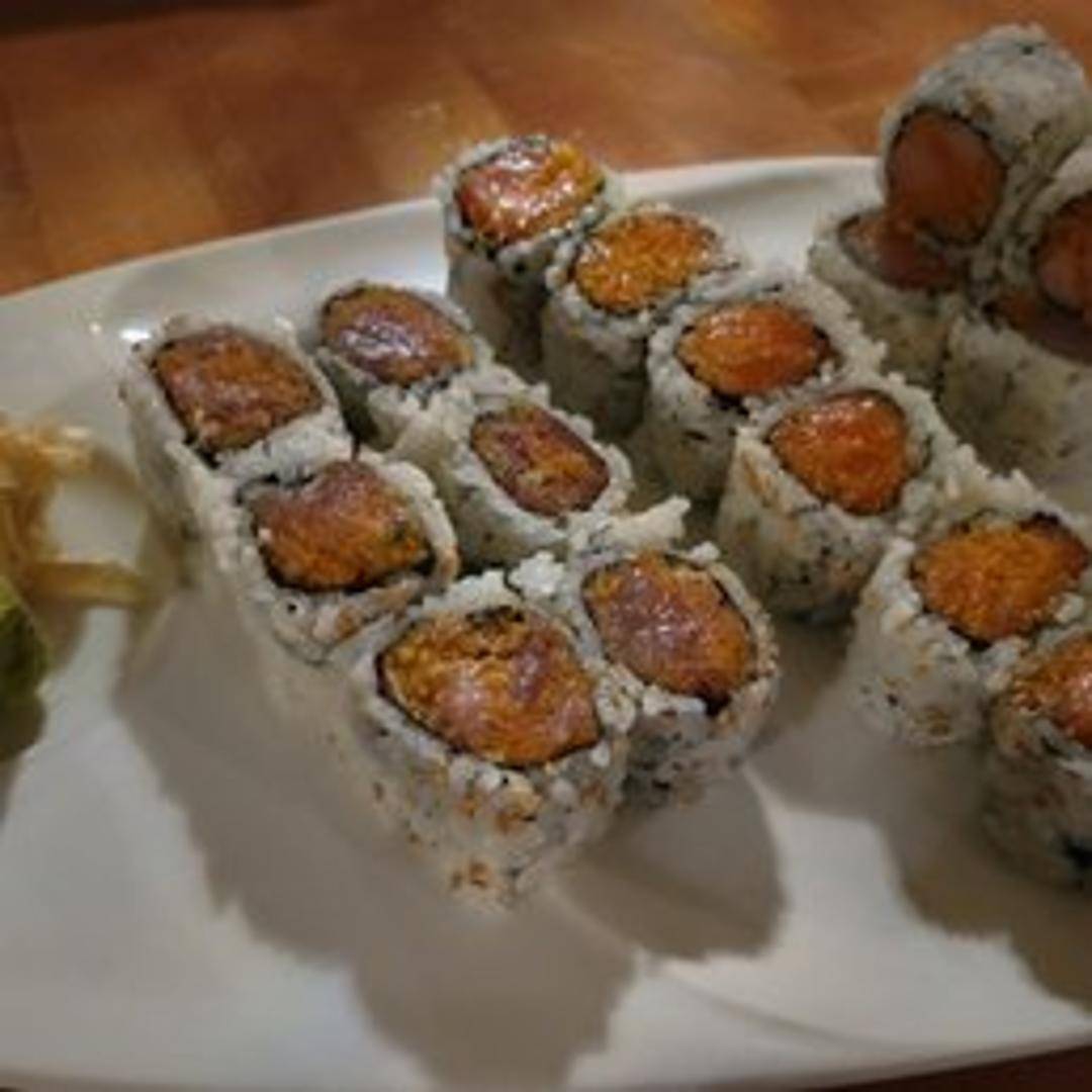 A selection of spicy maki rolls, including spicy tuna roll, spicy salmon roll, and spicy yellowtail roll. Garnished with spicy mayo and a sprinkle of sesame seeds.